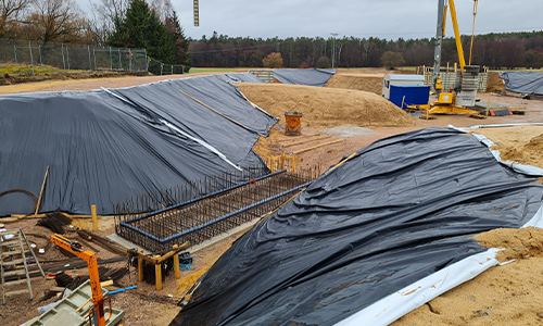 Wichtige infrastrukturelle Maßnahmen waren der Einbau von zwei Zisternen (DN 2500, je 15 m³), die Verlegung von etwa 50 m Stahlbetonleitungen und die Installation einer Flächendrainage (ca. 200 lfm), die das Regenwasser effizient ableitet. Ein stabiler Zaun sicherte die Baustelle, und eine provisorische Entwässerung gewährleistete die kontinuierliche Wasserableitung während der Bauphase.